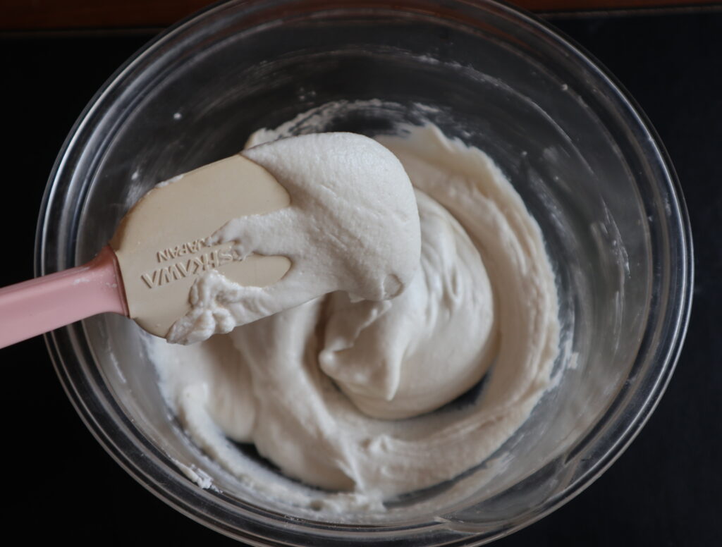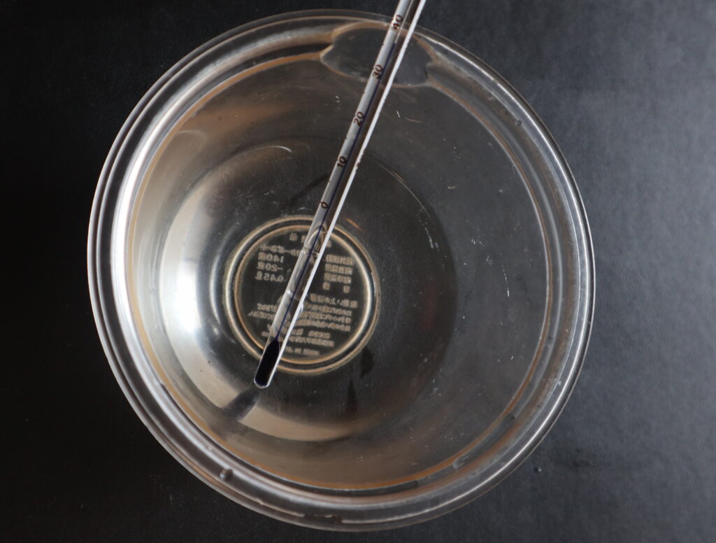 ぬるま湯を注ぎへらまたはゴムベラで全体を混ぜ合わせます。人肌くらいのぬるま湯は36~38度くらい。ボウルに水を入れて電子レンジでチンします。600Wで10秒~20秒、但し季節や温度によって適正な時間は変わるで、10秒ずつチンしながら様子を見るのがいいです。