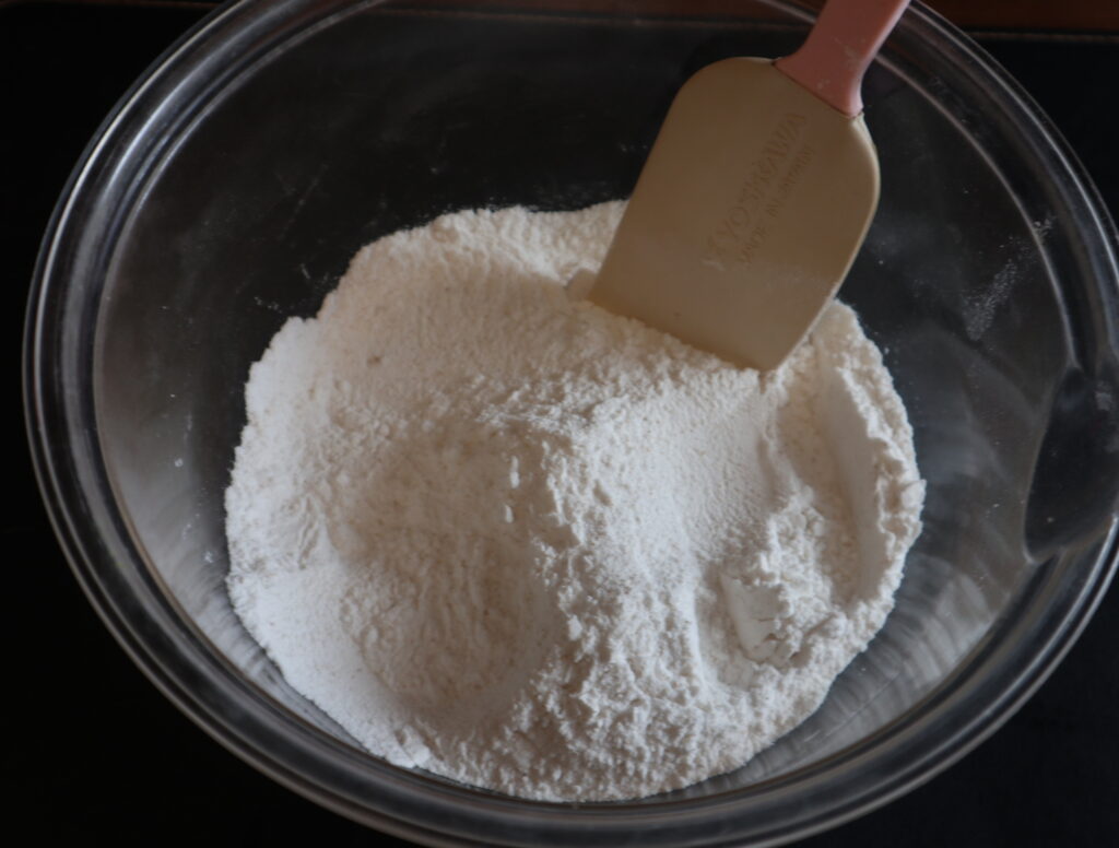 ボールに米粉を入れて、ドライイースト、塩、砂糖を入れて、へら(またはゴムベラ、大きなスプーンなど)で、均一に混ぜ合わせます。塩はドライイーストのすぐ隣に配置すると、水分を入れたとき、発酵を妨げるため、すぐ隣にはおかないこと(砂糖は隣に置くと発酵が進むので、置いてOK)といった注意点がありますが、あまり神経質にならなくても大丈夫かなと思います。