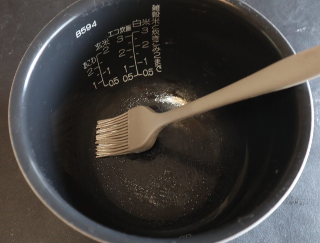 炊飯器に油を薄く塗ります。写真はゴム製の刷毛を使っていますが、油をキッチンペーパーや指につけて塗っても大丈夫です。油はパンをコーティングして、釜からはがれやすくするためです。炊飯器は3合炊き、パン焼き機能付きのものですが、今のところパン焼き機能は使っていません(そのうち試してみたいですが)。