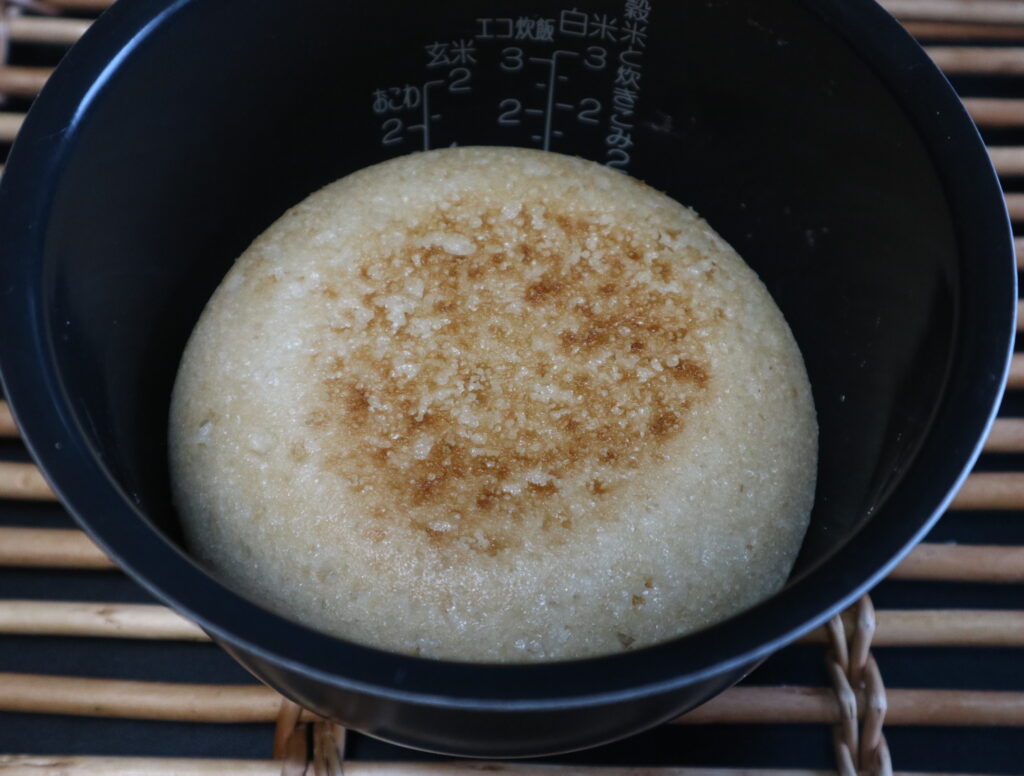 これで、本当に大丈夫?と不安になりますが、スイッチが切れると焼けていました。きれいな焼き色がついています。このままでもいいですが、好みで裏面にも焼き色をつけたい場合は裏返して裏も焼くといいでしょう。再度早炊きメニューでスイッチオンしました。