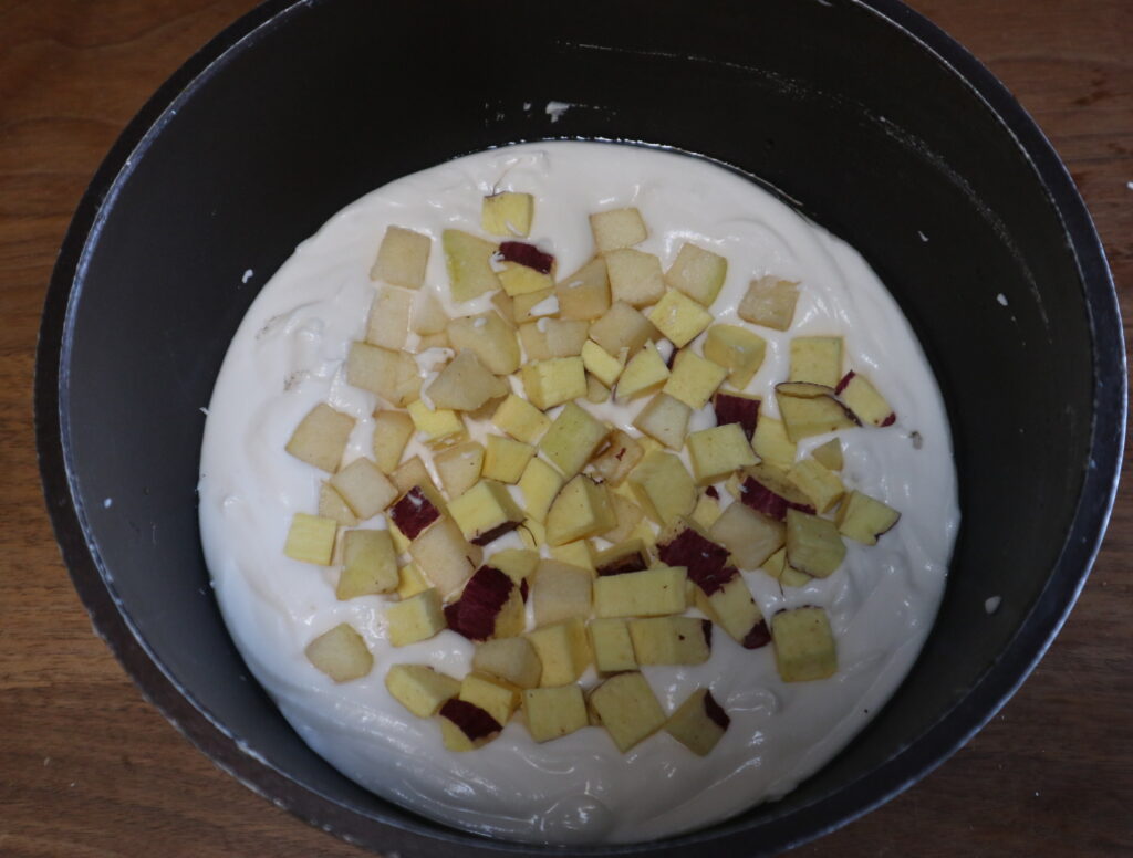 次に、りんごとさつまいもを入れて炊飯器で焼く米粉パンを紹介します。先に紹介したシンプルなパンと手順は同じですが、秋らしい具をたっぷりと加えてみました。チーズやレーズン、黒ごま、クルミなど、好みの具を入れてつくってみてくださいね。