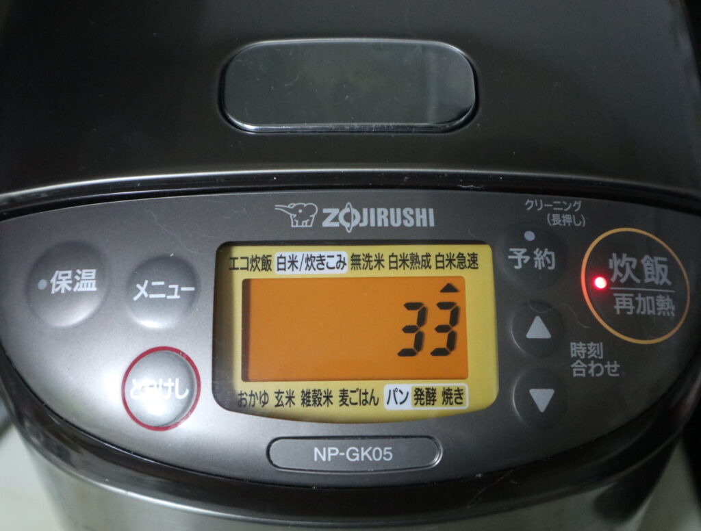 早炊きにセットしてスイッチオン。この炊飯器では、白米急速モードにセットして、33分でした。