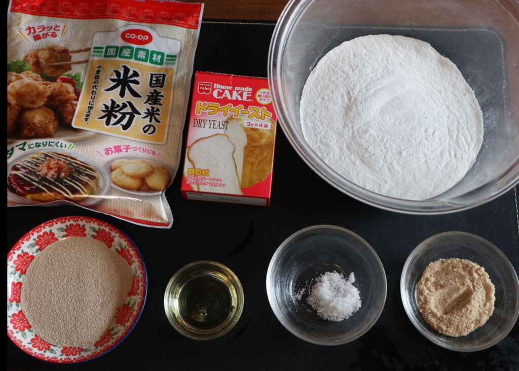 米粉はいろいろな種類があり、種類によって吸水率、膨らみ方、食感が違います。米粉パンの本や動画を見ると、「ミズホチカラ」をおすすめしている方が多いですが、まずは手に入りやすいもので試してみては。水分(ぬるま湯)は米粉の種類によって吸水率が違うので生地の様子を見ながら量を調整してください。料理用温度計(デジタルもあります)とタイマーがあると便利です。