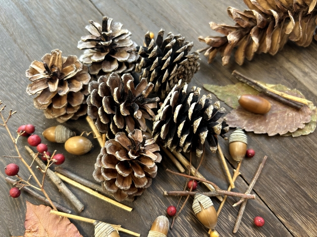 「木の実の話をしましたが、子どもたちは木の実にも興味津々です。ご存知の方も多いと思いますが、松ぼっくりの鱗片(りんぺん:うろこ状の葉っぱ)は、開いたり閉じたりしています。これは、周りが乾燥していると開き、湿気があると閉じる自然の仕組みで、外では閉じているけど、家に持って帰ったら開く場合もあって、『さっきは閉じてたけど開いたね。どうしてだろう』と問いかけて、一緒に考えるのも学びになると思います。