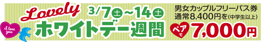 男女カップルフリーパス券(中学生以上)が、通常8,400円のところ7,000円とおトクです。