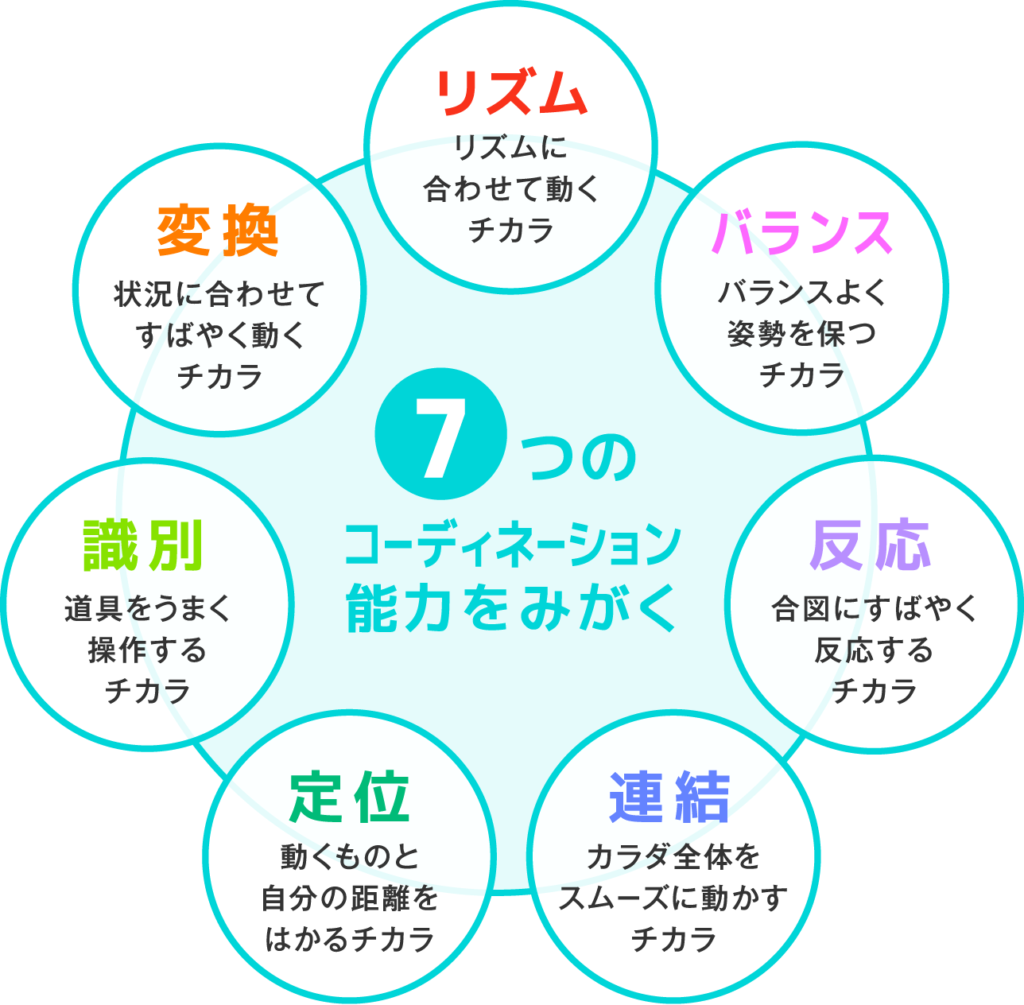 今回ご紹介する「運動能力開発スクール」は、現代の子ども達が育まれにくくなった「体を思い通りに動かす力」=「コーディネーション能力」を高めるために開発されたセントラルスポーツのオリジナルプログラムです。子どもの健やかな発育・発達のために必要な運動の基本となる7つのコーディネーション能力をバランスよく鍛えてくれる、従来の体操スクールとは異なるスクールになります。